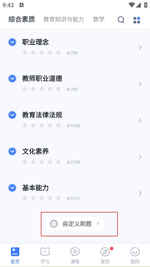 粉笔教师APP怎么修改成背题模式?1、在首页下滑到最下方,点击自定义刷题。
