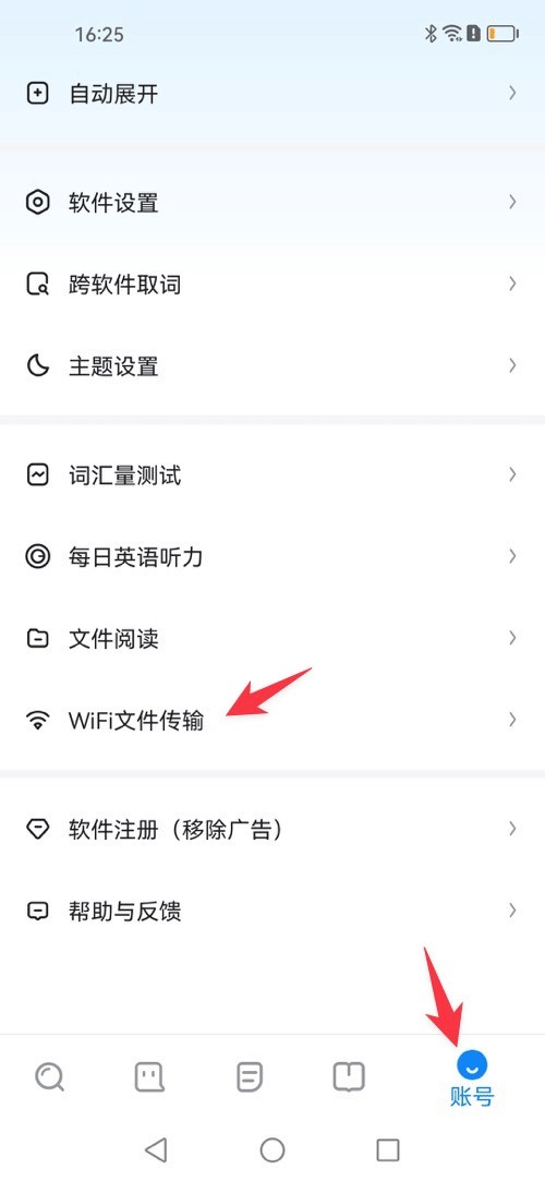 1、以欧路词典为例, 点击帐号Tab下WiFi 文件传输;