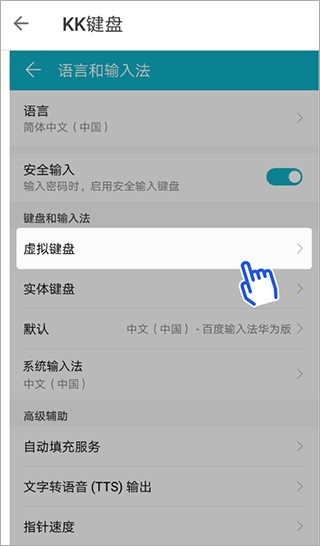 3、除此之外,大家还可以选择去手机的设置页面里找到“语言和输入法”功能,从“虚拟键盘”的功能里设置KK键盘为默认输入。