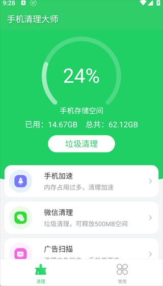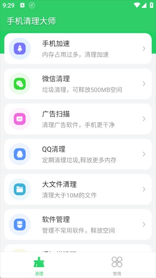 4、除基础清理外,手机清理大师App还提供手机加速、微信专清、广告扫描等细分功能,帮助用户针对不同场景进行深度优化。