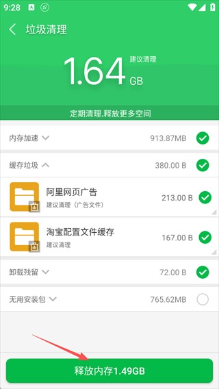 3、扫描结束后,会按类型展示可清理的垃圾文件及对应占用空间,勾选需要清理的项目,点击【释放内存】即可快速完成清理操作。