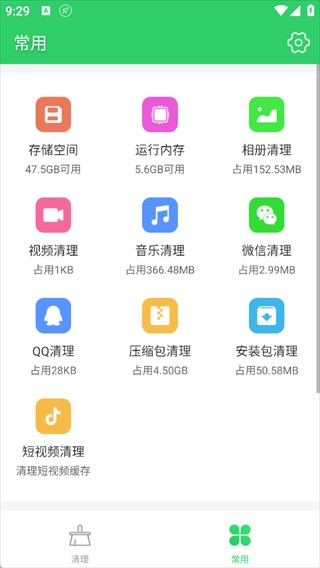 5、切换至【常用】板块,可快速使用存储空间分析、相册清理、微信清理等高频功能,清晰查看各类内容的空间占用情况,管理更高效。