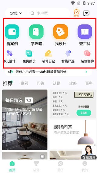 大家可以在首页查看案例,也能学习装修攻略,还可以找设计师等。