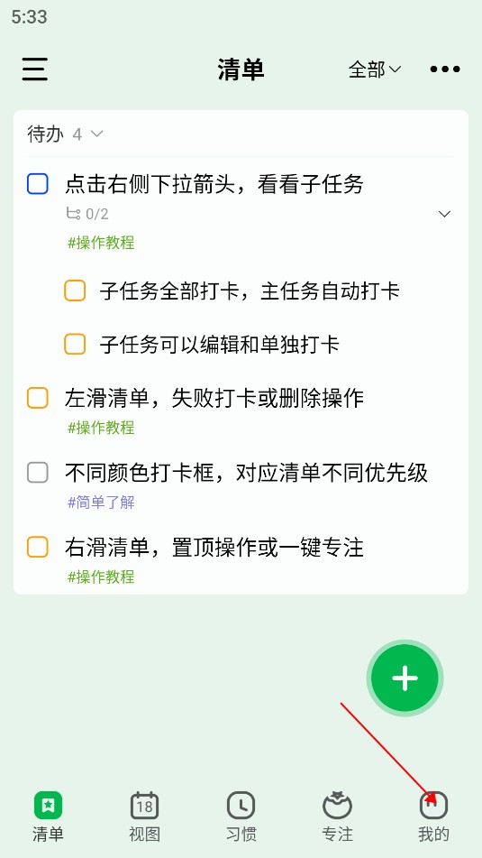 1、打开朝暮计划app,来到清单首页,点击右下角的“我的”按钮;