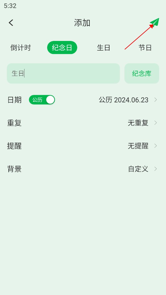 4、进入到添加纪念日页面,输入名称以及时间等信息,点击右上角的“保存”图标即可。