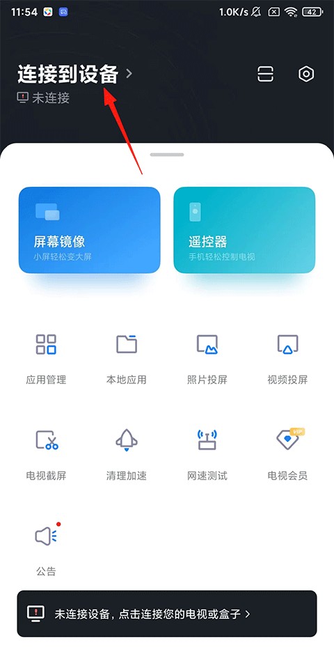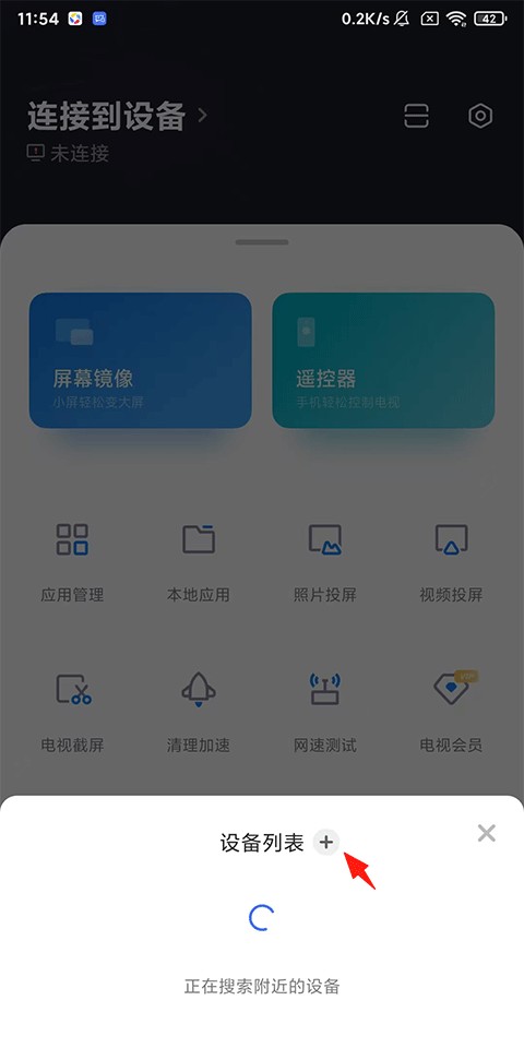 2、如果手机与电视连接着同一wifi,点击上图所示的位置可自动搜索电视点击即可连接,否则需要手动的添加设备