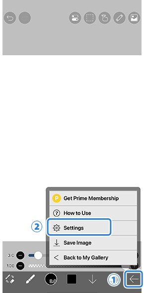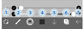 上图显示了主工具栏。按钮从左到右依次为: ①画笔/橡皮擦、 ②工具选择,③属性, ④色彩,⑤全屏幕,⑥图层和⑦返回.