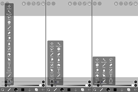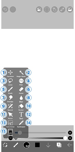 这些工具从上到下依次是:① 变换工具 , ②魔棒工具, ③套索工具, ④滤镜工具、⑤画笔工具、 ⑥橡皮擦工具, ⑦涂抹工具、 ⑧ 模糊工具、 ⑨特殊钢笔工具、 ⑩油漆桶工具,⑪矢量工具,⑫文本工具,⑬帧分隔器工具、⑭吸管工具、 ⑮ 画布工具。