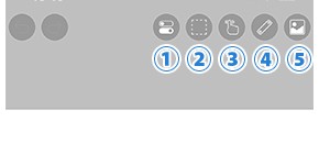 右上角的按钮从左到右依次为: ①查看菜单,②选择区域工具,③稳定器工具、④标尺工具,以及⑤材质工具。