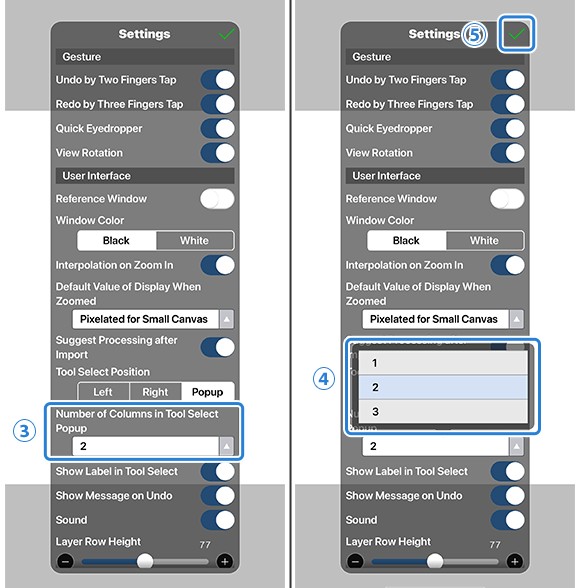 ※1 只有当工具选择位置设置为弹出窗口时,您才能选择列数。