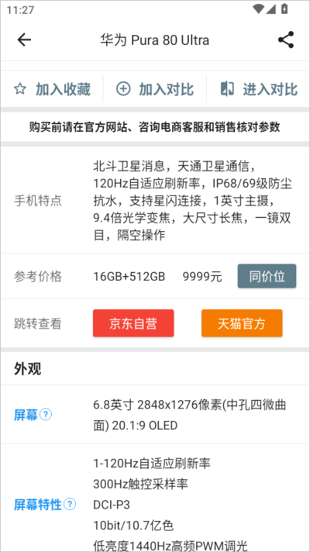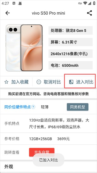 2、在详情页点击“加入对比”按钮,将该机型加入对比列表;