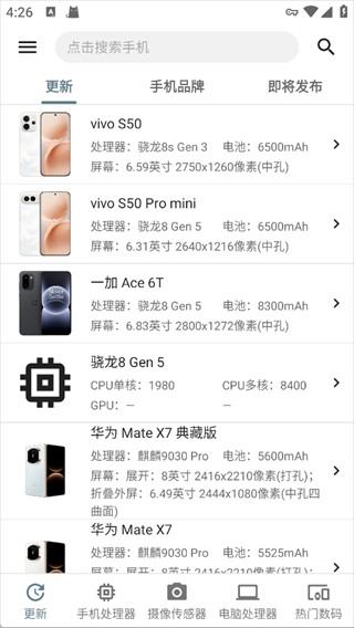 1、打开手机性能排行App,在“更新”页面找到想要对比的手机并点击进入详情页;