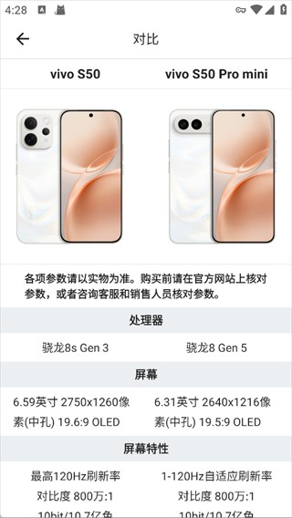 5、最后即可查看两款手机的处理器、屏幕等核心参数的详细对比信息。