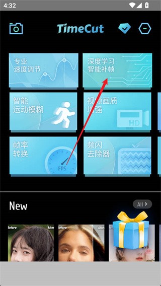 1、打开软件后,进入“智能补帧”功能。