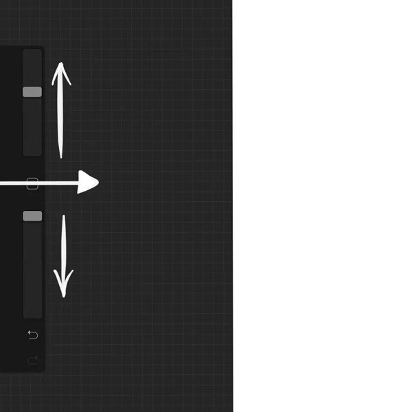 侧边栏可以快速调节当前所用画笔:上半部分的滑条调整当前画笔尺寸、下半部分改变画笔的透明度、中间的矩形默认可以用于打开取色器,你也可以在偏好设置中将其改为别的快捷按钮。