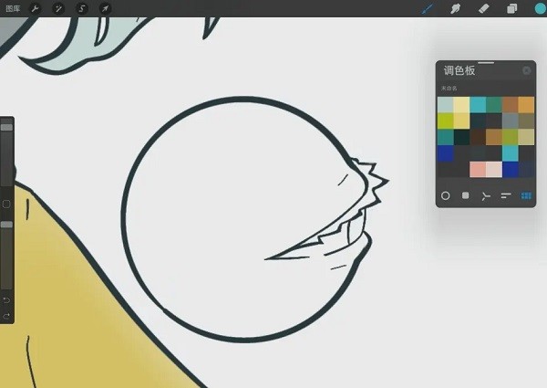 填色阶段,你将用到的一个比较隐藏的功能:色彩快填。你可能已经意识到了,你没有在 Procreate 中见到类似油漆桶工具的按钮,其实这个叫色彩快填的工具是藏在色盘按钮里了。