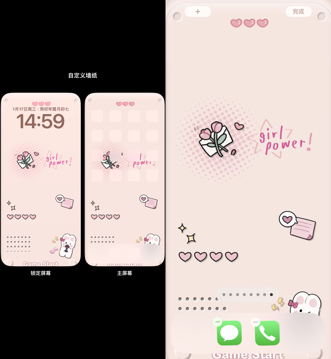 3、回到锁屏页设置墙纸组合,设置墙纸的时候记得不要选择模糊效果噢。回到桌面长按主屏幕,直到出现左上角加号