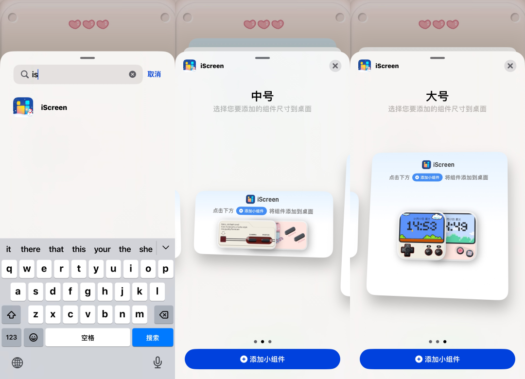 4、点击左上角加号,搜索iScreen添加大号和中号组件