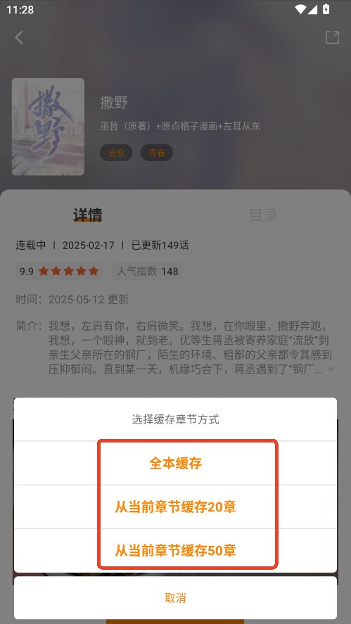 2、离线缓存方式不同,可以选择全本缓存、20章和50章缓存。