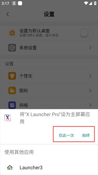 5、选择“仅此一次/始终”,并选择XLauncher Pro即可