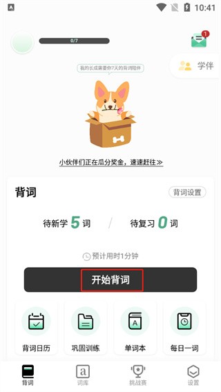5、背词主页可查看待新学与待复习词数,并配有多项辅助功能按钮如“单词本”、“项目训练”等。