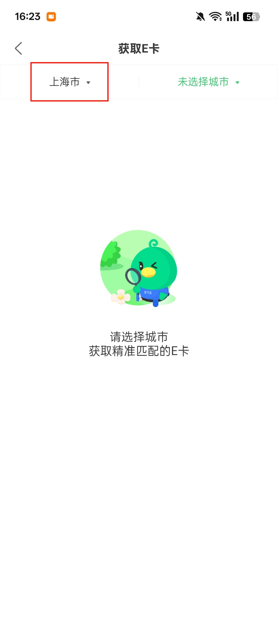 2、目前地区是上海,点击【在线获取E卡】