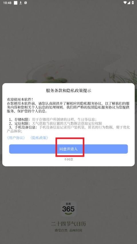 1、打开24节气万年历安卓版,点击同意相关协议。