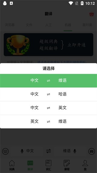 2、选择好之后进入首页,可以发现共有“词典”、“翻译”、“词汇”、“课程”以及“我的”五项功能;