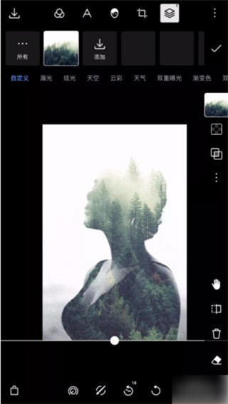 2、可以看到,这时候就已经形成了多重曝光效果,这是因为在多重曝光界面中选择的所有素材,其混合模式都已经被默认为“变亮”了,无须我们再去手动调整。我们还可以切换到其他图片;