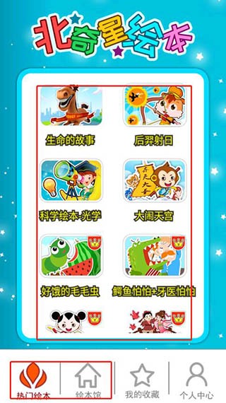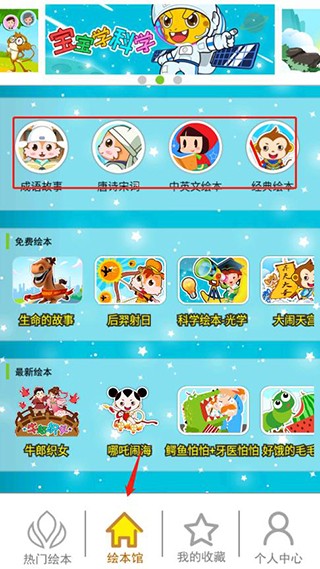 1、在首页中选择绘本馆,在绘本馆可以看到北奇星绘本软件还有成语故事、唐诗宋词、中英文绘本和经典绘本等分类;