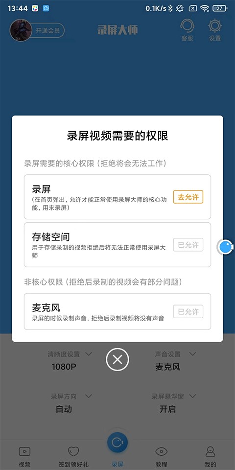 2、将录屏需要的权限都打开即可开始录屏;
