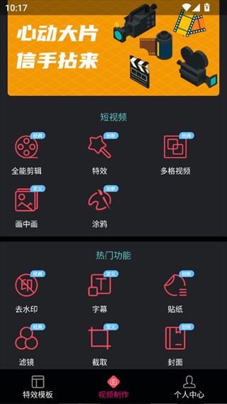 1、打开视频剪辑助手App,软件分为两大板块【视频制作与特效模板】其中,视频制作板块包含短视频剪辑和热门工具功能。