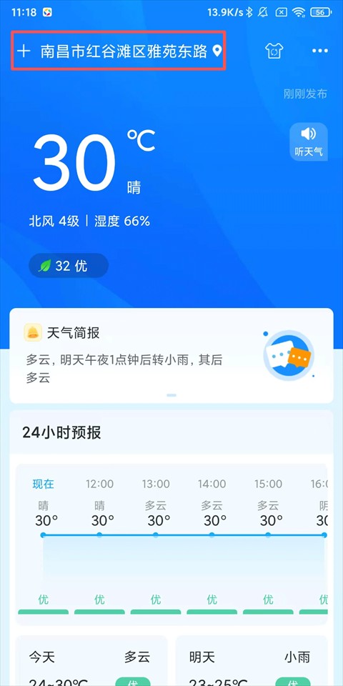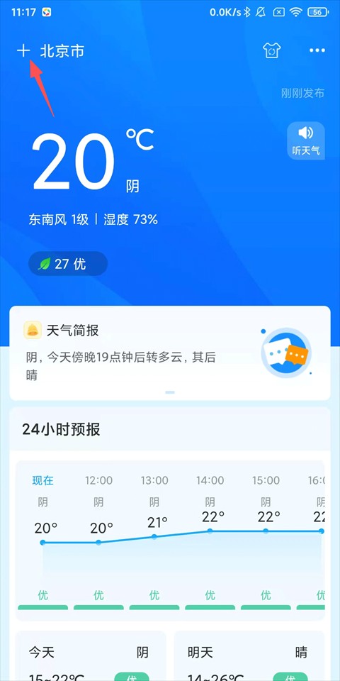 1、打开本地天气官方版,点击左上角的+按钮;