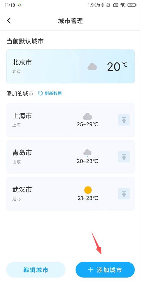 2、点击下方【添加城市】;