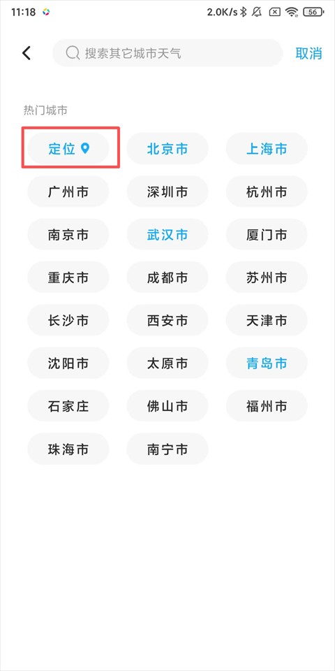 3、在搜索栏搜索你所在的城市或点击【定位】进行定位;