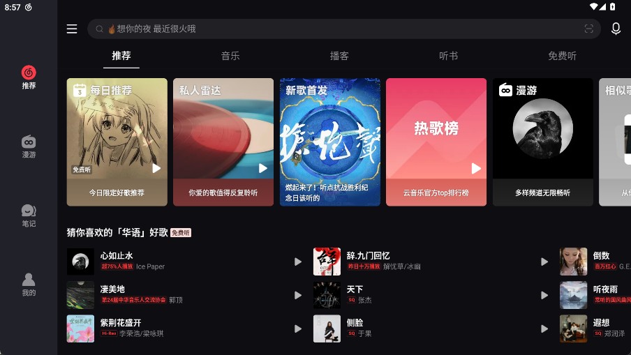 网易云音乐hd安卓版是一款专业好用的音乐播放类软件。软件针对大屏进行设计,整体使用体验更加大气,操作界面更加清晰,使用体验大大提升。软件完美的适配了电视平板界面,能以更加直观的形式展示给用户。通过大屏无广告为用户带来更加沉浸的体验。需要音乐播放软件的用户快来下载使用吧!