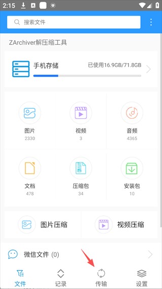 1、打开ZArchiver解压缩工具手机版,在底部导航栏点击「传输」选项卡,进入文件传输页面。