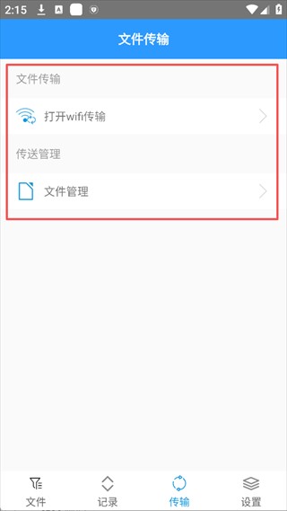 2、在文件传输页面,点击「打开WiFi传输」选项,进入WiFi文件导入界面。