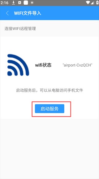 3、在WiFi文件导入界面,点击蓝色的「启动服务」按钮,开启远程文件访问服务。