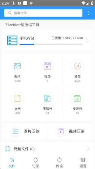 这是 ZArchiver 的主界面,可查看手机存储占用情况,快速分类管理图片、视频、音频、文档、压缩包等文件,还支持图片 / 视频压缩解压等功能。