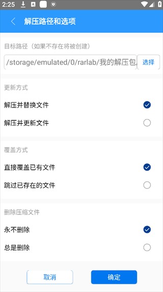选择「解压文件」后进入该页面,可自定义解压目标路径、文件更新 / 覆盖方式,以及是否解压后删除原压缩包,按需设置后点击「确定」即可执行解压。