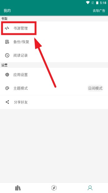 2、进入“我的”界面后,在书架板块点击“书源管理”。