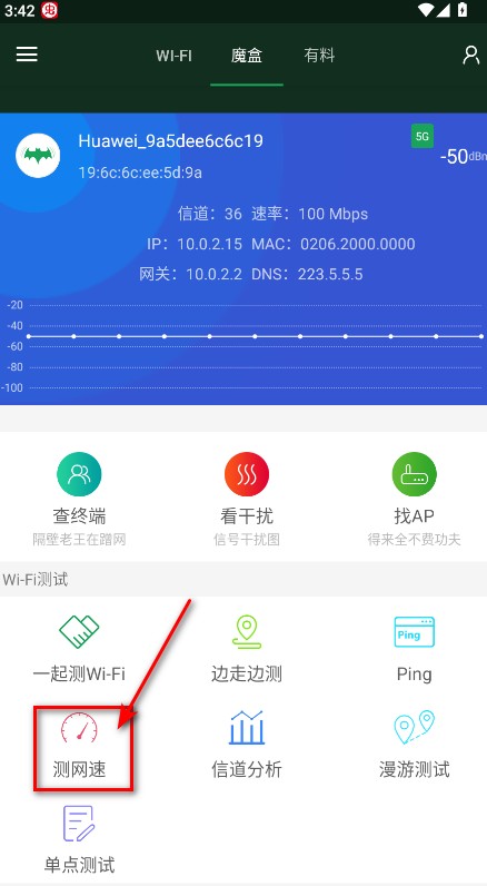 2、打开“WiFi魔盒”--选择正上方“魔盒”--点击“看干扰”--可查看干扰情况